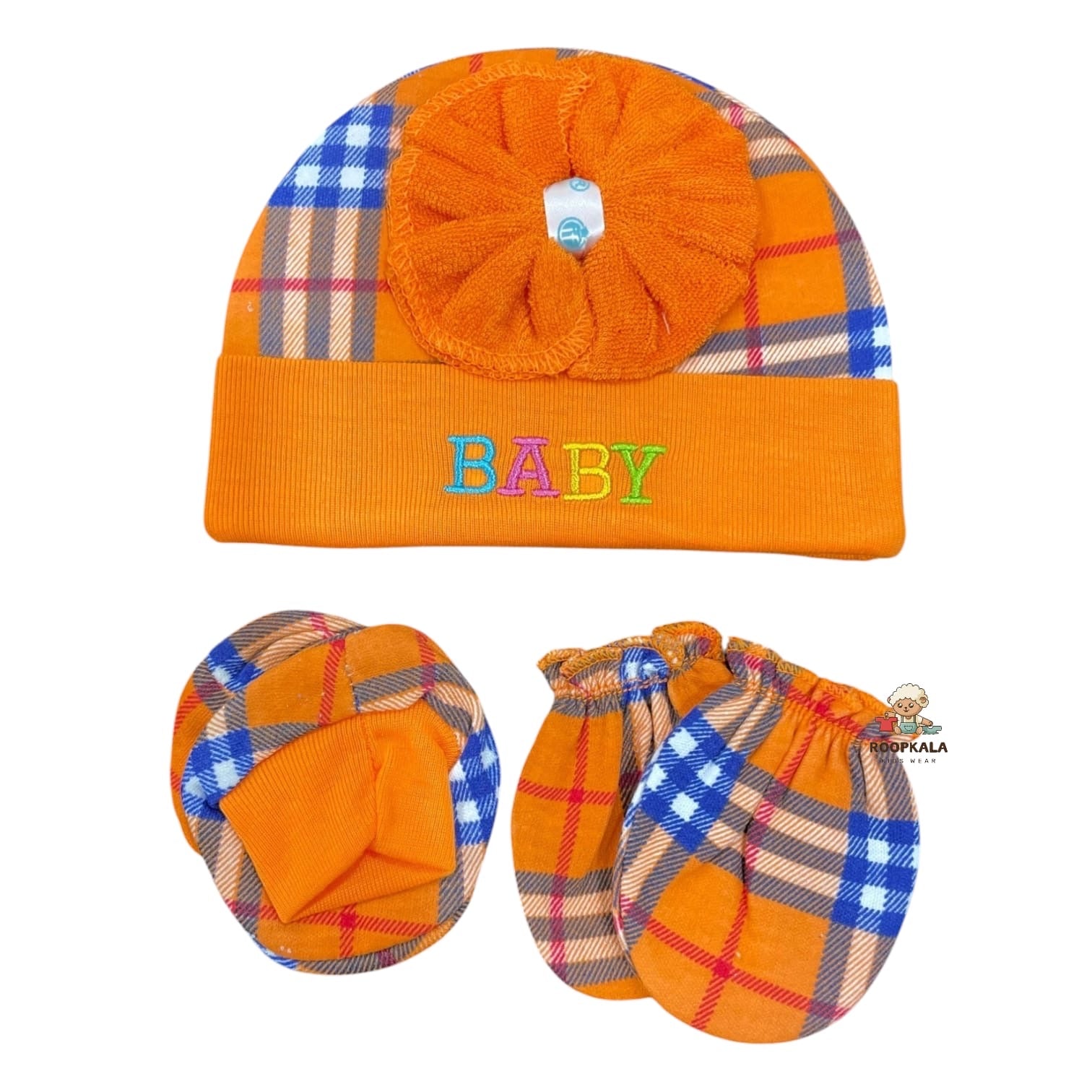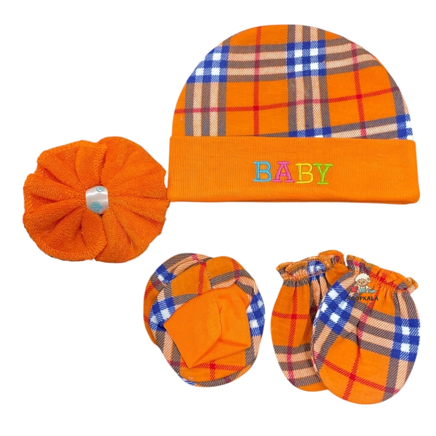Keep your newborn cozy and stylish with this 5 piece baby essentials set, specially designed for 0–6 months. The set includes a soft cotton fancy cap with embroidered “BABY” text, a pair of comfortable mittens, matching booties, and a handy small hanky. Made from gentle cotton fabric, this set is skin-friendly, breathable, and safe for delicate baby skin.