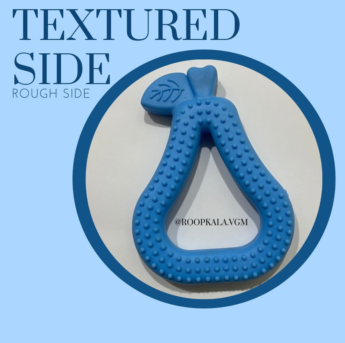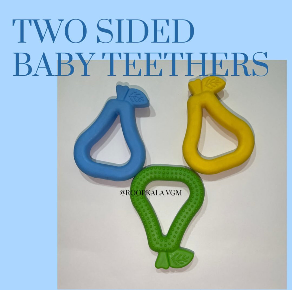 A dual-sided baby teether featuring one textured side and one smooth side.