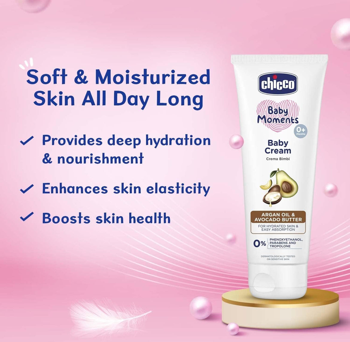 - Soft and Moisturized Skin: The all new Chicco Baby Moment Baby Cream deeply moisturizes baby’s dry skin areas like face, hands, and body. Its light and quick absorbing formula protects the skin against dryness and keeps baby's skin soft and smooth all-day