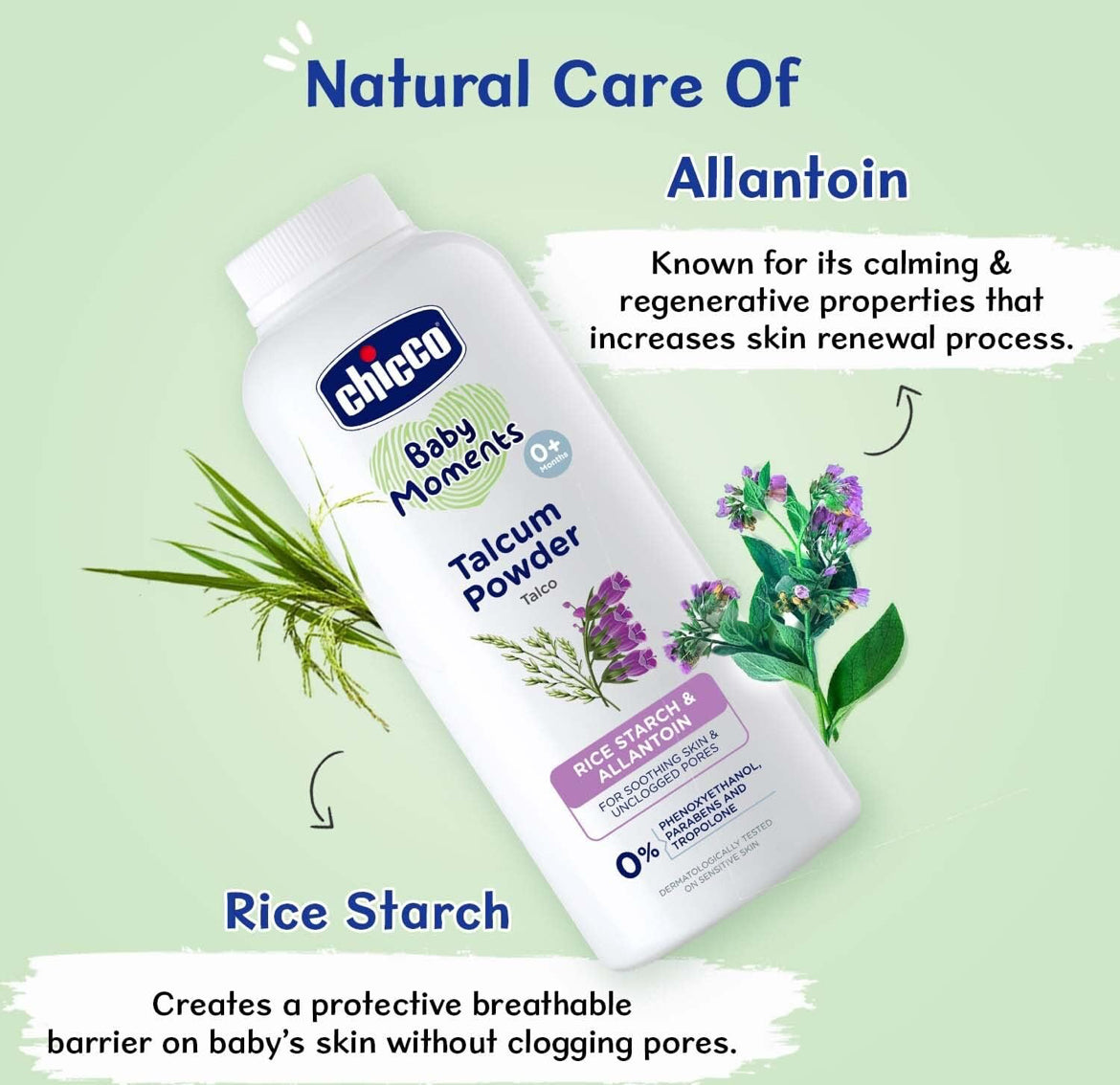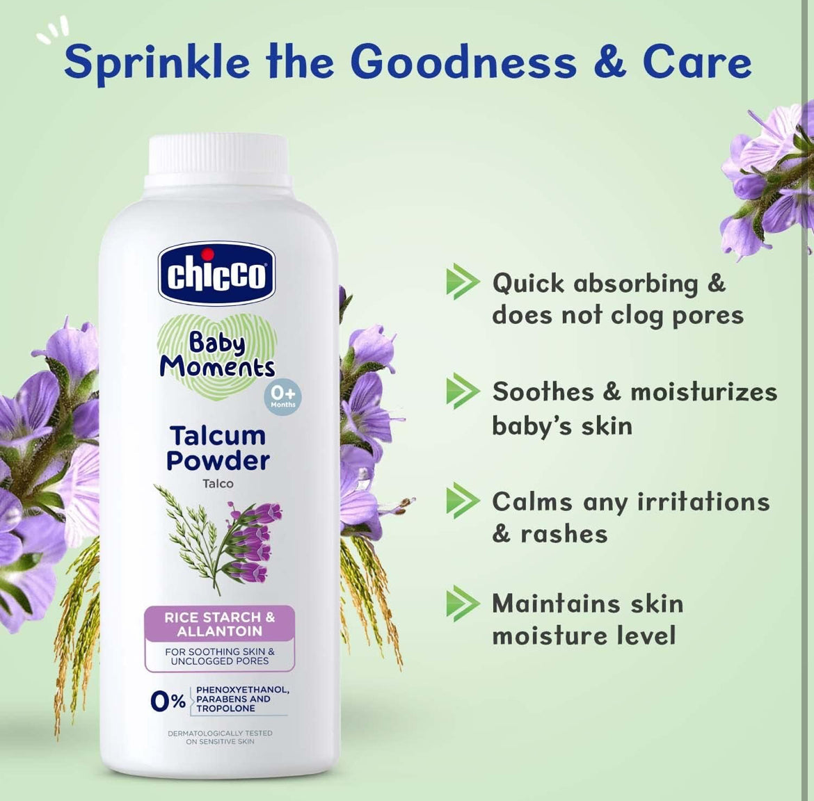 - Ultra-Soothing & Quick-Absorbing: Chicco Baby Moments Talcum Powder doesn't clog baby’s skin pores and gets quickly absorbed for faster action. It helps maintain skin moisture balance and supports skin renewal process to keep baby’s skin soft and refresh