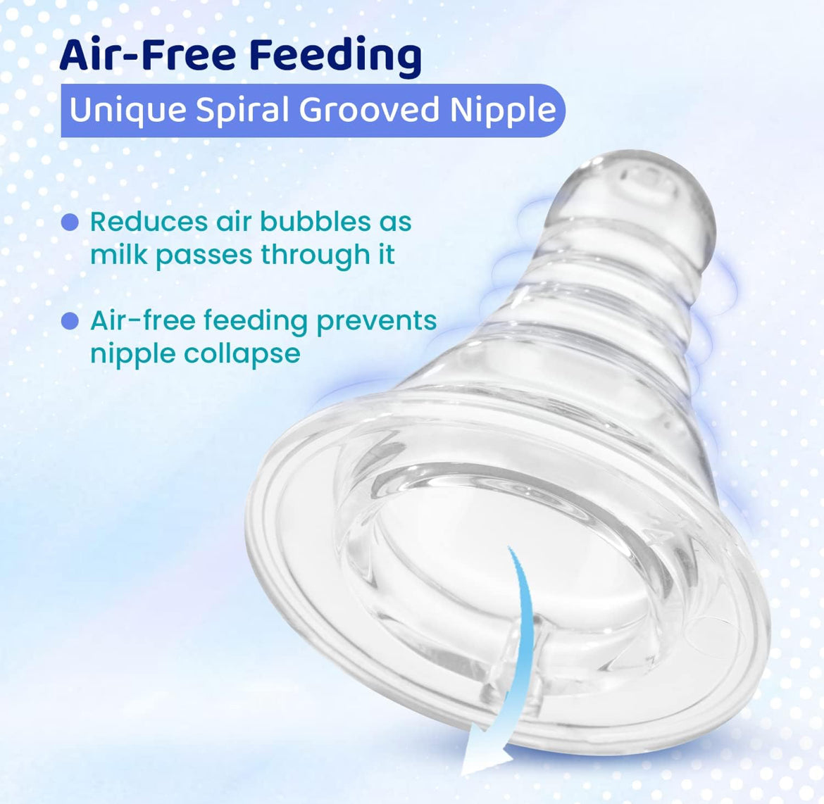 - Spiral grooved nipple: spiral ring like texture on the nipple helps minimize air bubbles as the milk passes through it resulting in an air free feeding and further prevents nipple collapse
