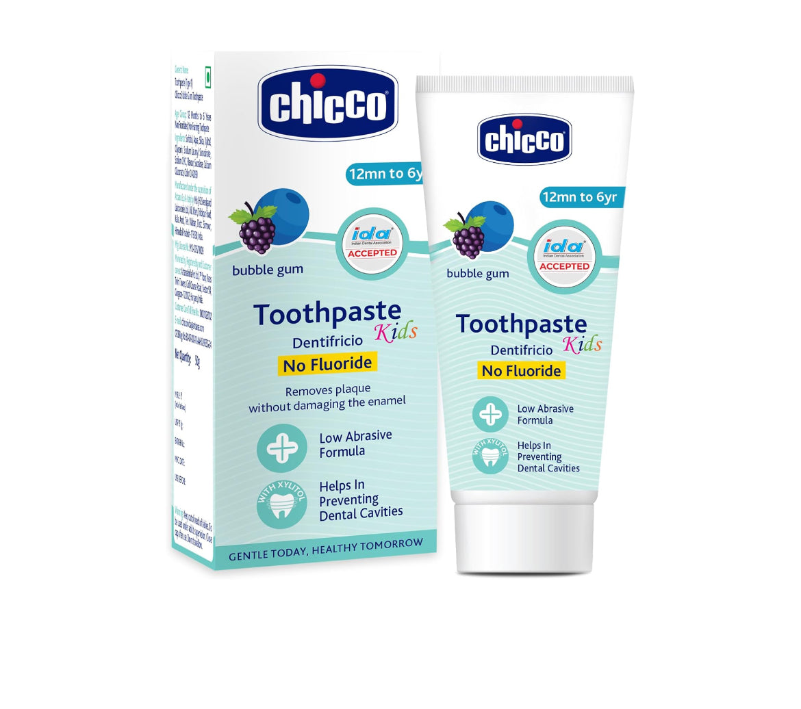Chicco Toothpaste for Kids, Best for Baby (1y-6y), bubblegum Flavour, 50g | Fluoride-Free & Low Abrasive | Removes Plaque, Helps Prevent Cavities | IDA Accepted